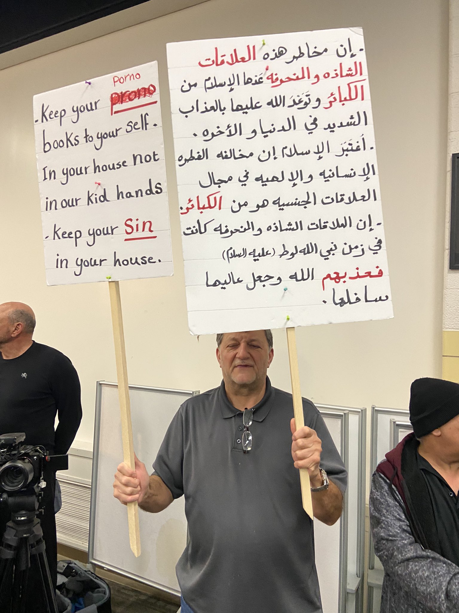 Videos revealed angry scenes and overcrowded rooms, with loud jeers and booing directed at speakers and school board officials, while placards in Arabic and English featured denunciations of the “big sin” of homosexuality and the “grooming” of children.